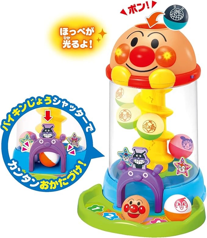 호빵맨의 머리에 부속된 공을 넣으면 '펑!' 소리가 나고, 구르는 공에 맞춰 수다와 멜로디가 흘러 호빵맨의 뺨이 빛납니다.