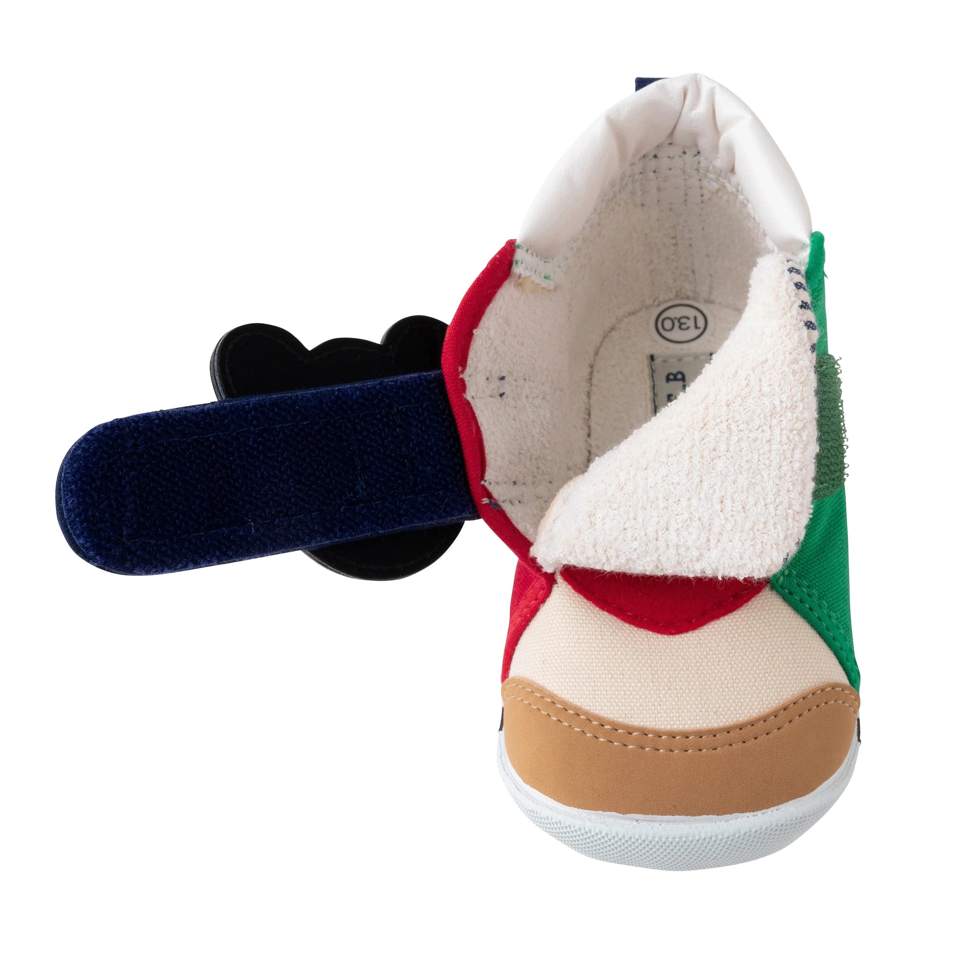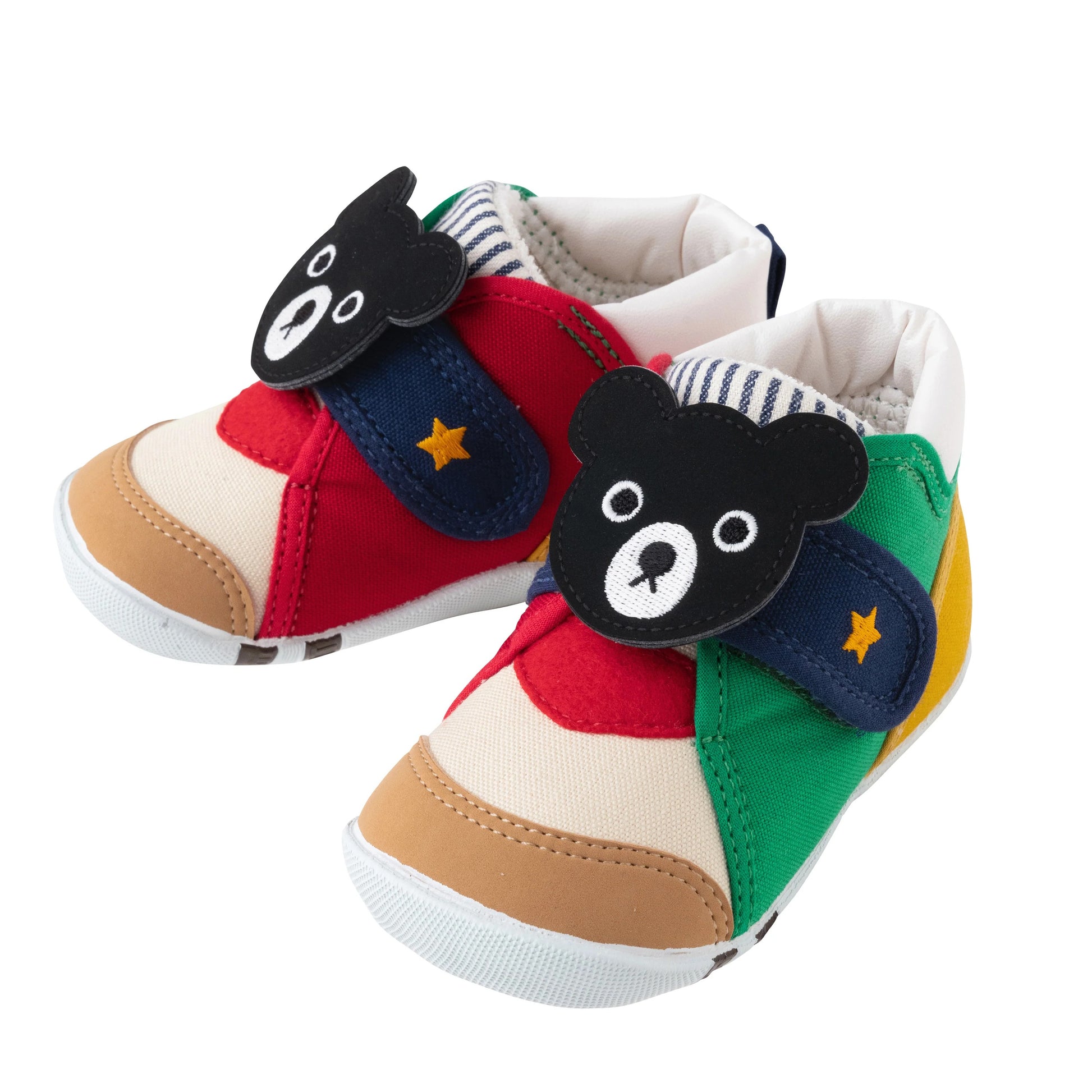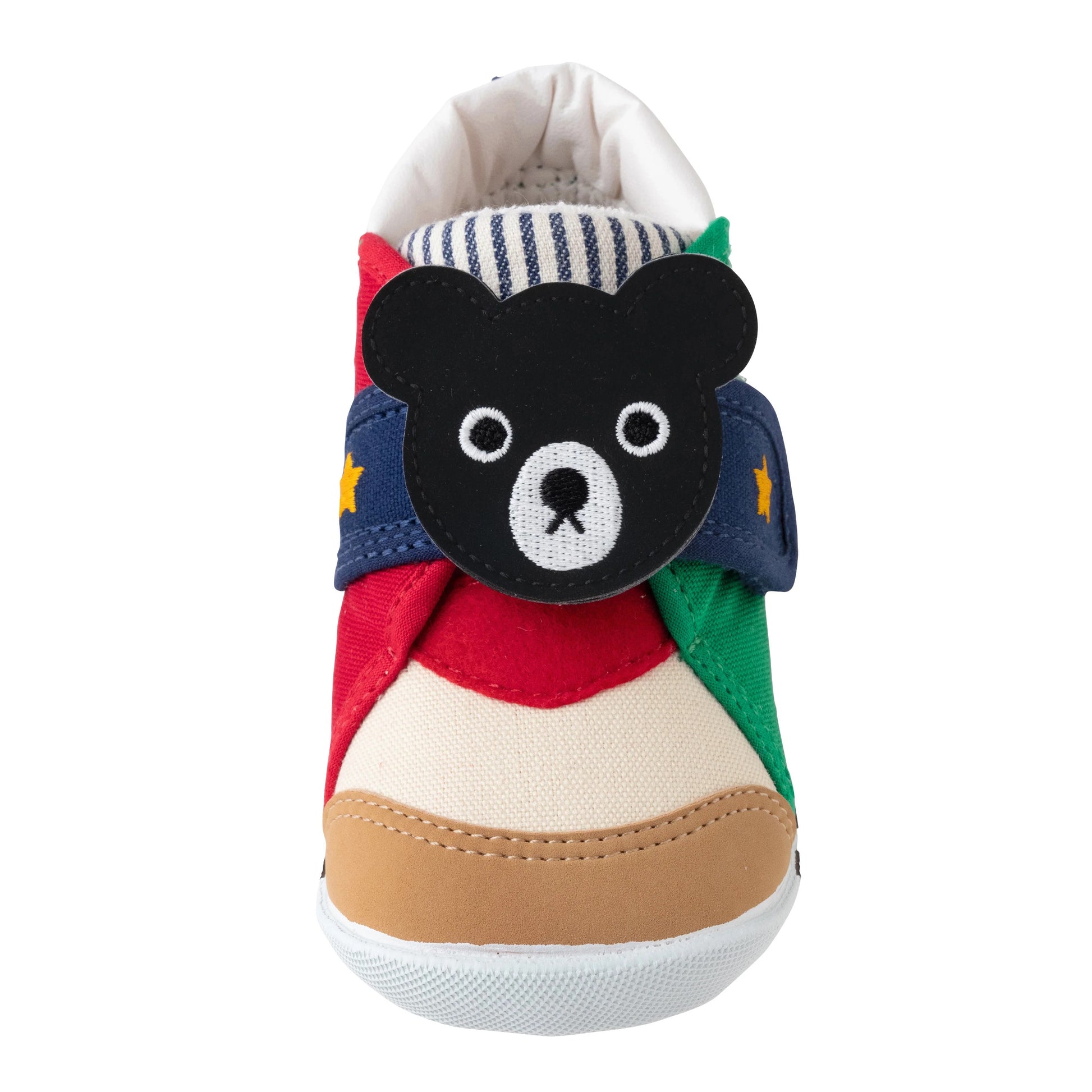 검은 곰 얼굴이 붙은 인기 디자인의 패스트 베이비 슈즈입니다. 합성피혁에 자수를 놓은 얼굴 모티브나, 히코리 무늬의 벨로 부분, 붉은 반다나 등 더블 B다운 디자인의 아기 신발.